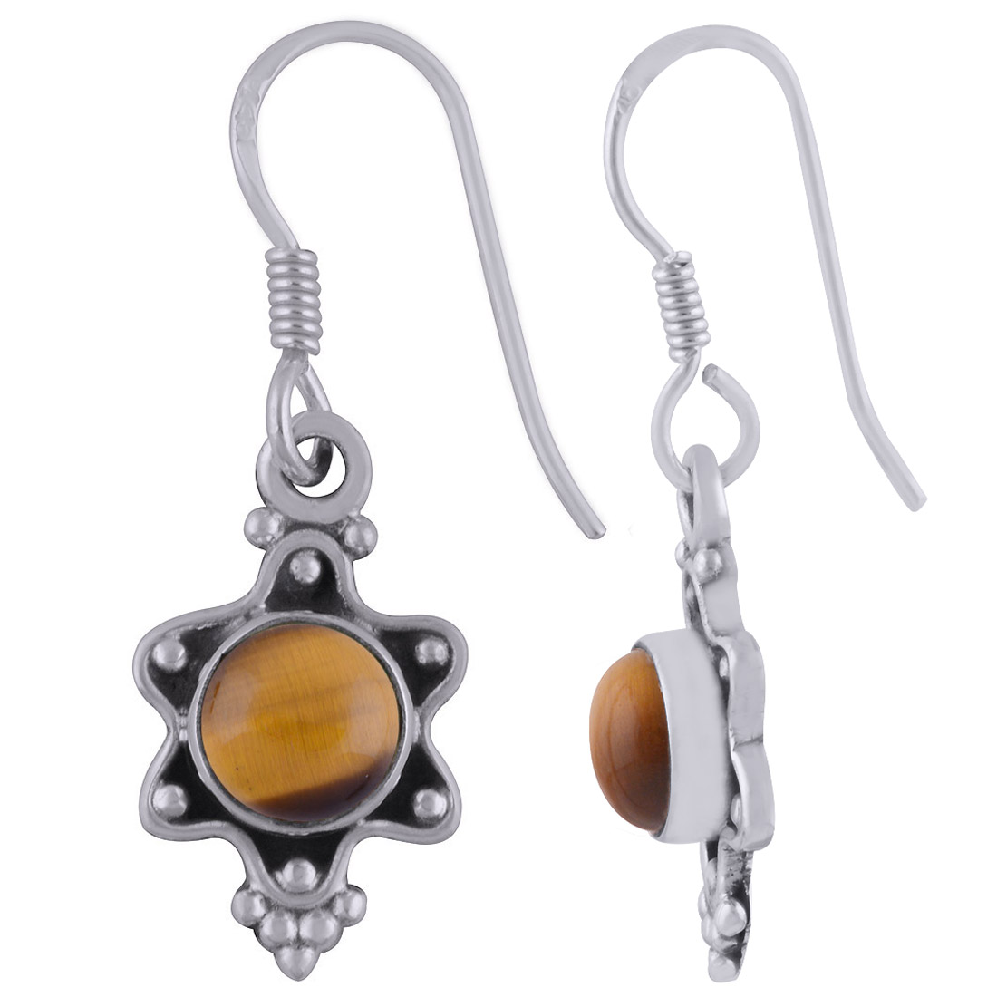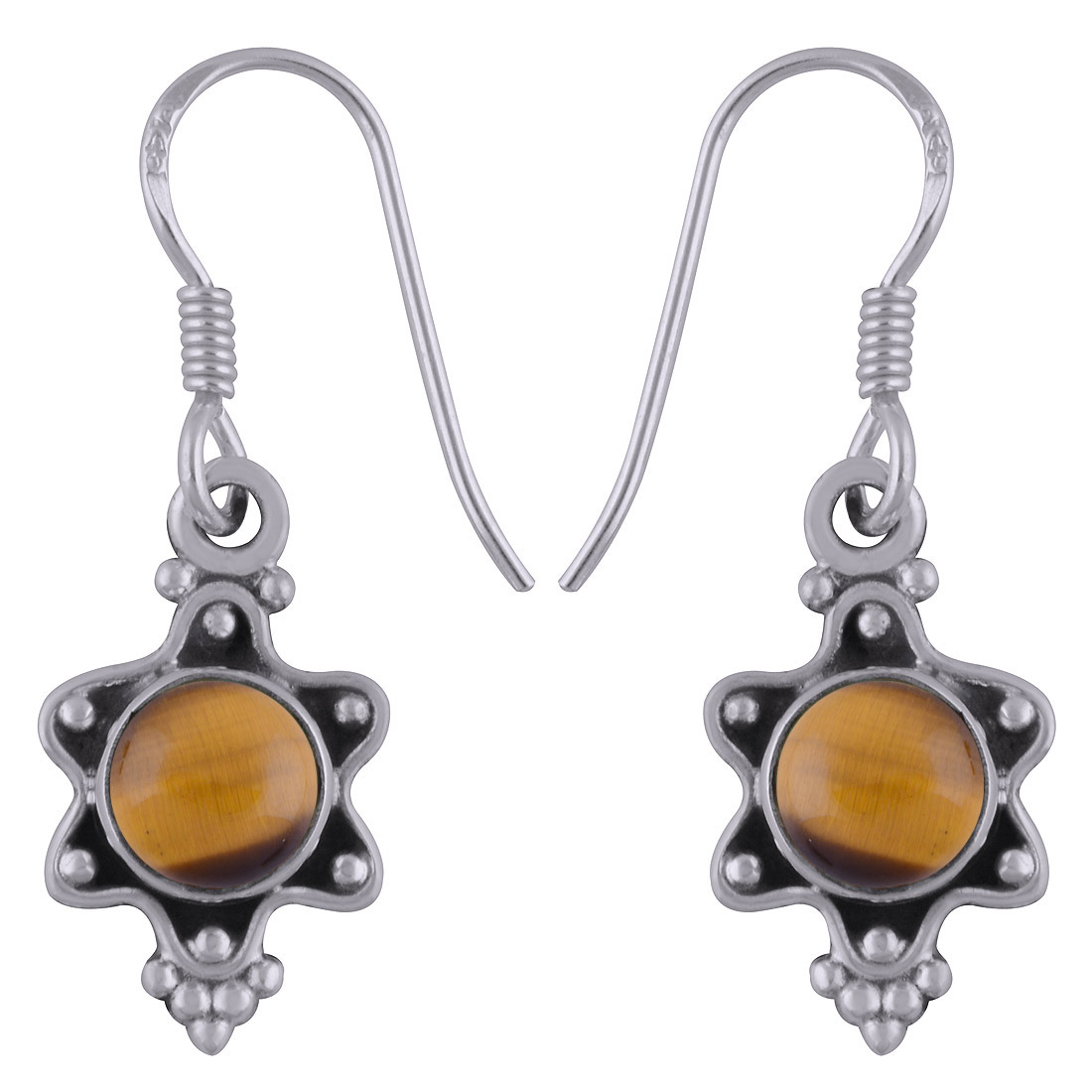 TIGER EYE NATURAL GEMSTONE 925 STERLING SOLID SILVER ROUND CABOCHON STONE HANDMADE EARRINGS